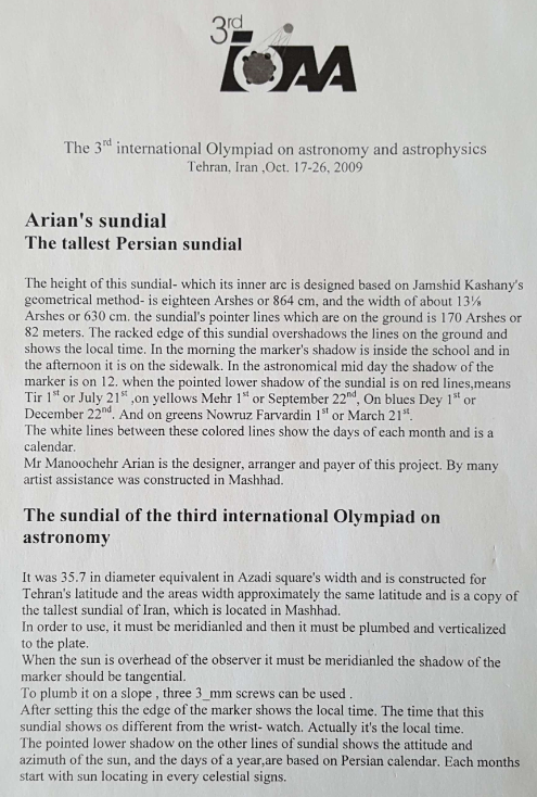 در سال 1388 برای یادبود همایش سومین المپیاد جهانی نجوم به همه ی شرکت کنندگان همایش که از سراسر جهان آمده بودند هدیه ای در نظر گرفته شد. این هدیه را از روی بزرگترین ساعت آفتابی ایران و به عرض تهران ساختم و به آنها هدیه دادیم.