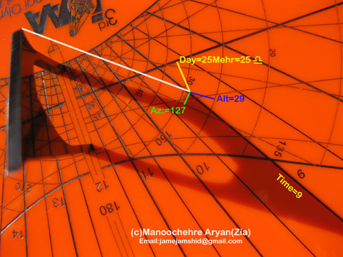 سایه نک تیز پایینی شاخص بر روی خطوط دیگرِ صفحه ی ساعت افتاده و زاویه ی ارتفاع خورشید(Alt) ، زاویه ی سمت خورشید(Az) و روزهای سال را بر پایه ی تقویم ایرانی به ما نشان میدهد که با نشست خورشید در آغاز برجهای فلکی و برابر آغاز ماههای ایرانی در نظر گرفته شده است.