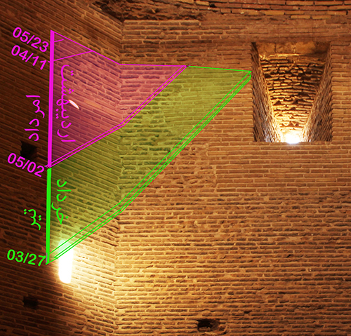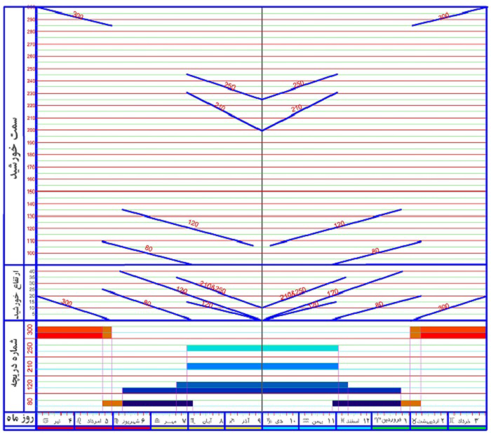 - روزهای ورود نور دریچه ها در سال و ارتفاع و سمت نور آفتاب ورودی از دریچه ها برگ 59 کتاب