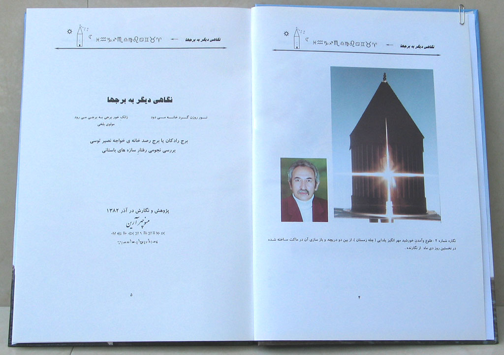 4) برج رادک یا برج رادکان؟ - آغازِ چله زمستان ( یلدا ) و آغازِ چله تابستان در برج- چگونگی نموده شدنِ نوروز و نوروزگاه برج رادکان؟! - نوروز گاهِ برج خواجه نصیر توسی - رفتار نجومی برج کشمار و برج گنبد سرخ مراغه - آغاز ماههای دیگر در برج رادک…………………….....…………36